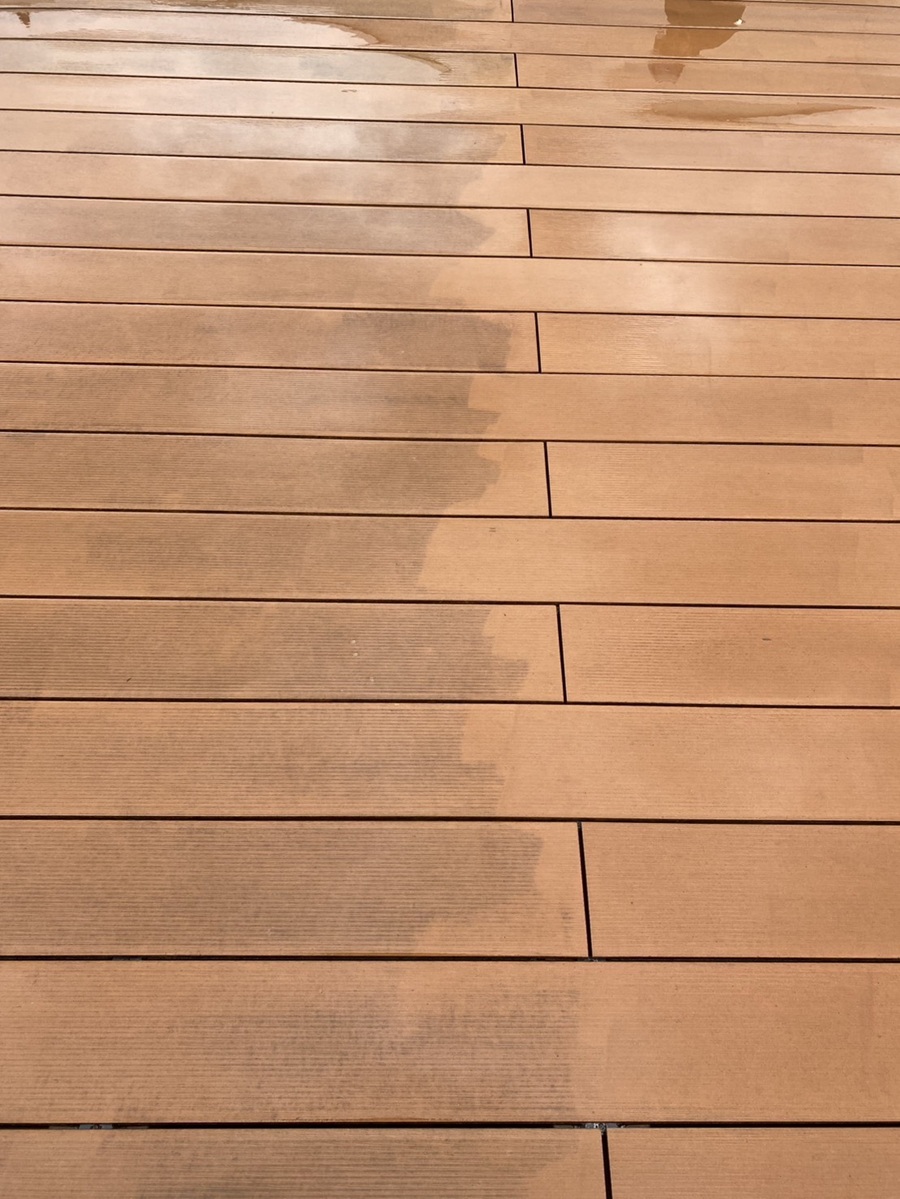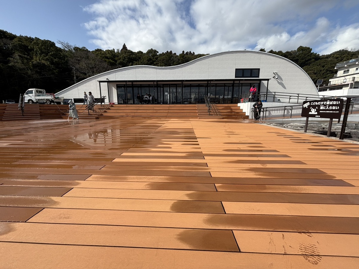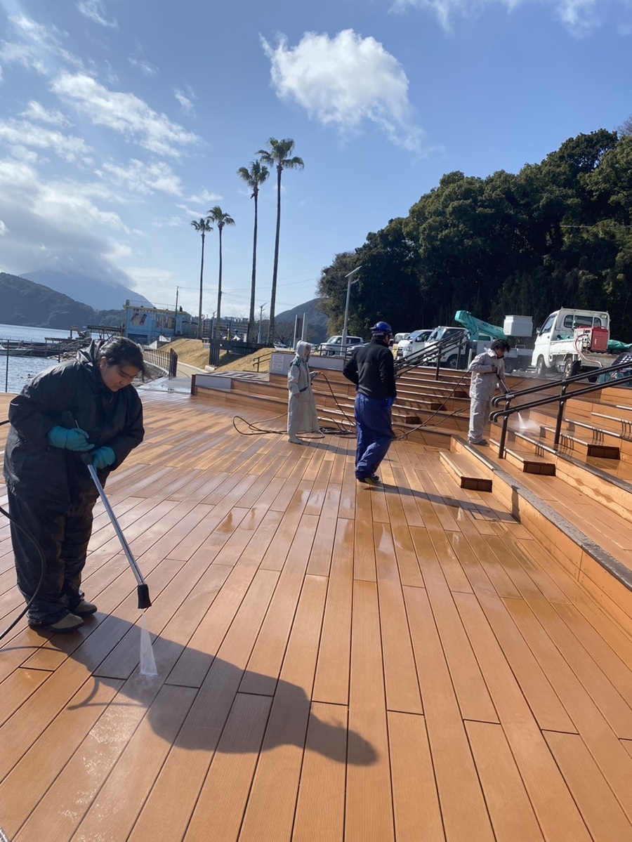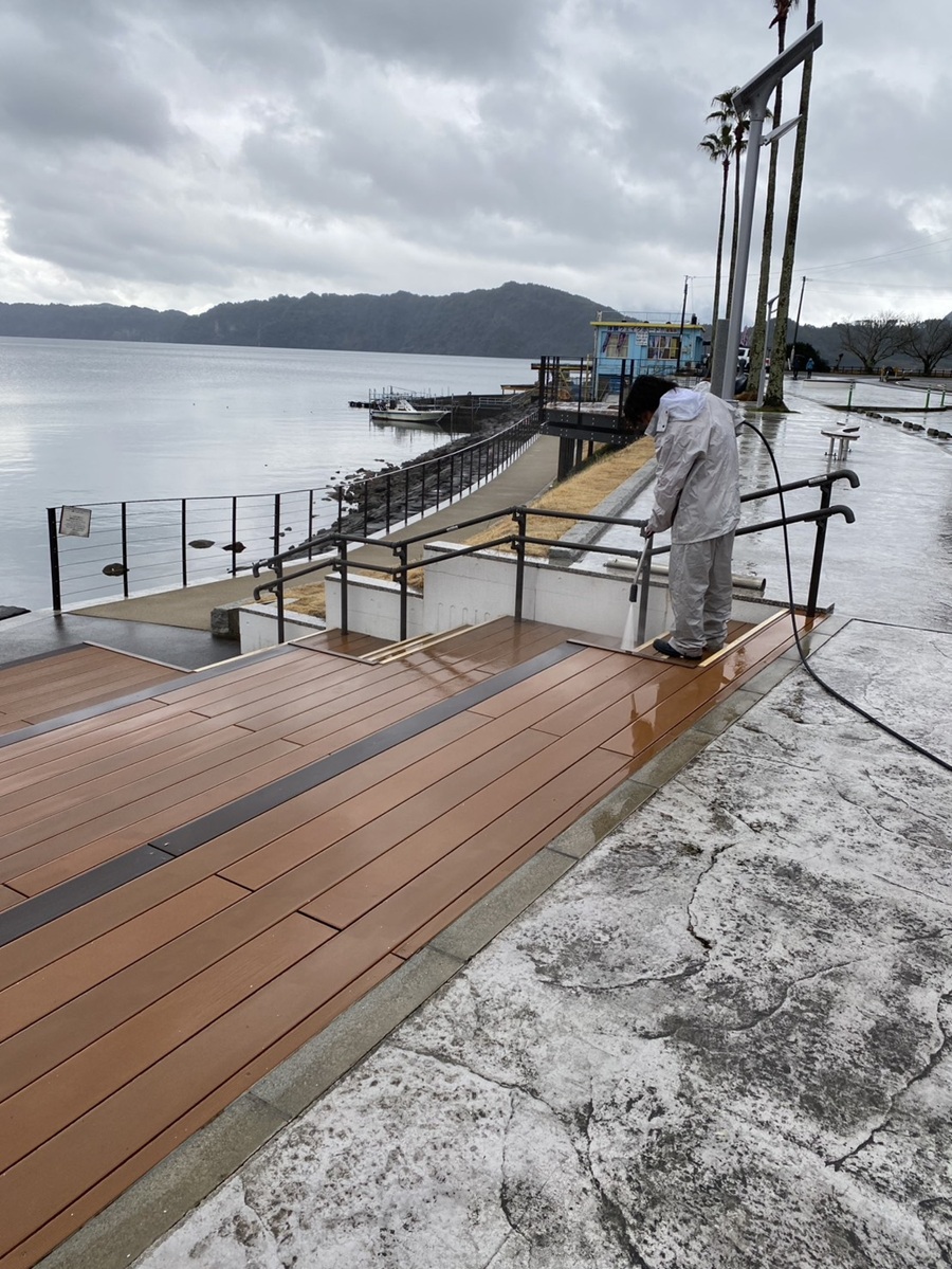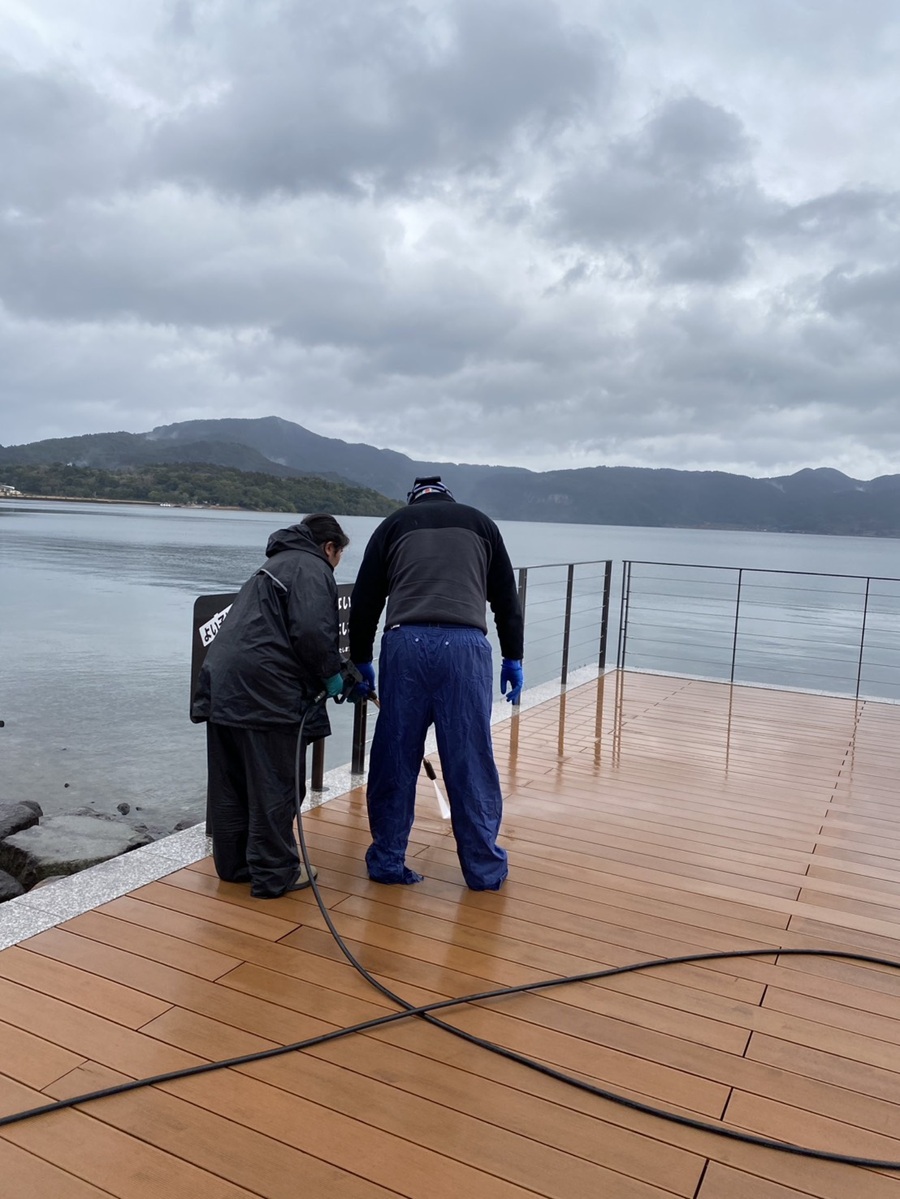 お得意様の池田湖のカフェ様の定期ウッドデッキ、外壁高圧洗浄サービスとなります。